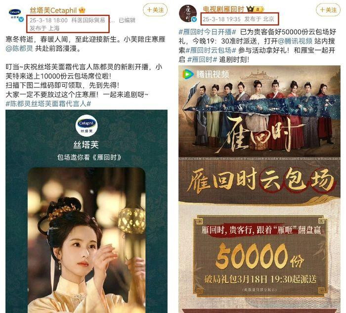 比如屡传空降的《雁回时》,其主演陈都灵代言的丝塔芙发布庆祝开播云包场微博,这条微博甚至比腾讯视频和《雁回时》官微宣布开播时间都要早上1个小时,可谓直接戳中并安抚了粉丝们焦急等待的心。