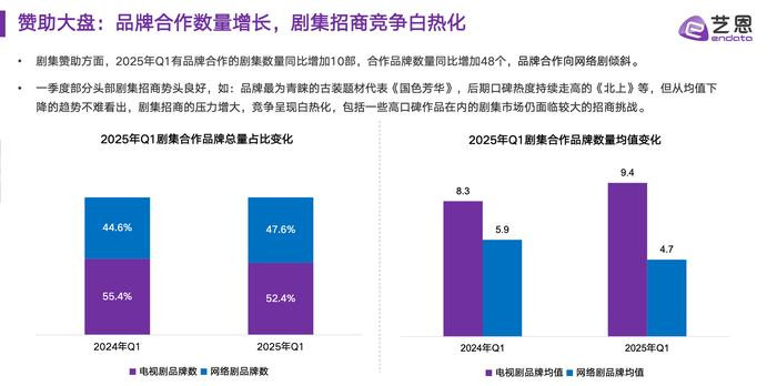 冠名热度减弱之下,剧集招商的好与难也同样显现。据艺恩数据发布的《2025年第一季度剧综赞助市场洞察》显示,2025年Q1有品牌合作的剧集数量同比增加10部,合作品牌数量同比增加48个。