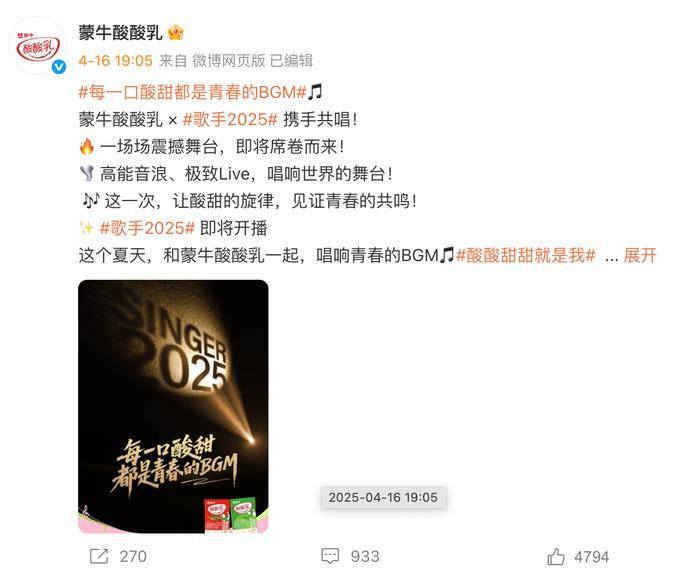 也因此,去年的剧集营销大户、拿下多部剧剧集冠名的蒙牛,也转移了内容策略,从今年开始又重新回到了“综艺赞助”的怀抱,无论是年度S+级重磅综艺《歌手2025》,还是平台方力推的创新年番综艺《一见你就笑》,都被其拥入怀中。
